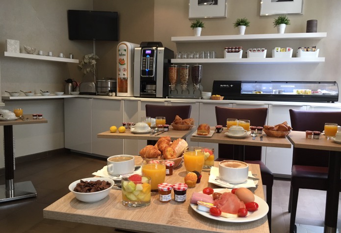 El hotel Viator Paris, les propone un desayuno continental en la sala a partir de las 6H30 hasta las 10H00, pero puede ser entregado en su propia habitación, pidiéndolo en la recepción.